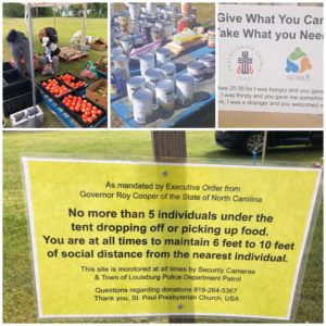 The tent went up with nothing under it but empty pallets, signs that state “Take what you need. Give what you can.” and prayers for the ability to deliver what God needed from us. Our first event was preparing 35 bag lunches for the homeless. Then members of the church contributed money and products to initially stock the pavilion. The community response was immediate and with gratitude. But we realized that St. Paulcould not do this alone. On our daily checkups of the pavilion,we noticed items that we did not put there, or people would givea donation while “shopping” at the pavilion. People in the community are giving what they can. We are also receiving help from other community and faith organizations from as far as 120 miles away. A few of God’s helpers include the Franklin CountyInterchurch Council made up of local churches, Tar River Baptist Association, Red Springs Mission Camp, Alpha Kappa Alpha, Inc. Omega Lambda Omega Chapter, Delta Sigma Theta Sorority, Inc. Oxford-Henderson Alumnae Chapter, members of Franklin County Narcotics Anonymous, Cal-Maine Foods, Louisburg, Heritage High School, Wake Forest, NC, NC Baptist Men/Baptists on Mission, and individual contributors.